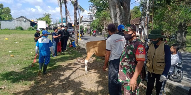 DENPASAR – Babinsa Koramil 1611-07/Denbar Sertu Gede Wasana bersinergi dengan Bhabinkamtibmas mendampingi petugas dalam pelaksanaan vaksin ternak untuk mencegah PMK (Penyakit Mulut dan Kuku) di Desa Padangsambian Kaja Kec Denpasar Barat Kota Denpasar. Kamis (04/08/22)