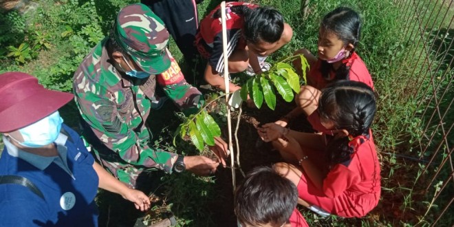 Denpasar – Babinsa Koramil 1611-02/Densel Serka Zikirman Bersama Bhabinkamtibmas menghadiri kegiatan kegiatan Bakti Sosial (penanaman pohon) dari Yayasan Idep yang bertempat di lapangan wayan bulit kelurahan serangan kec Densel Kota Denpasar. Jum’at (22/04/22).