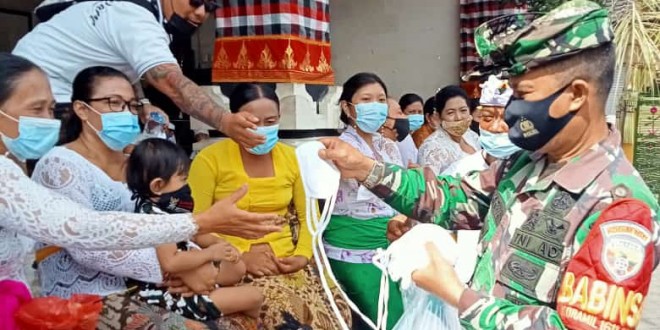 “Para Babinsa membagikan masker kepada masyarakat yang tidak memakai masker melaksanakan kegiatan atau aktifitas di tempat keramaian salah satunya yaitu Pasar Adat Desa Petang ,Kecamatan Petang Kab. Badung.