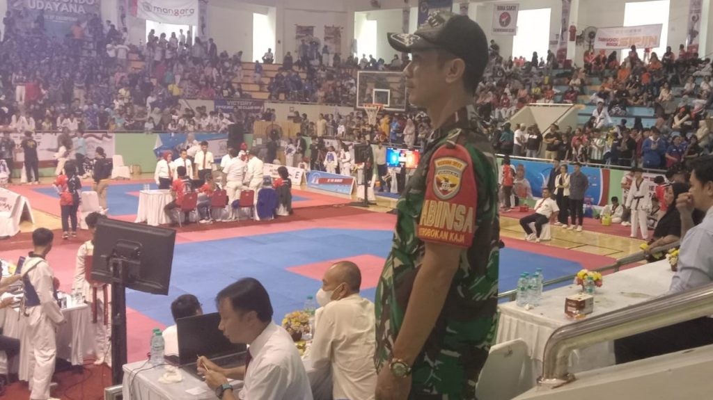 BADUNG – Babinsa Koranil 1611-03/Kuta Pelda Arkadius memantau serta mengamankan kegiatan kegiatan Bali Open Taekwondo International Championship 2023.