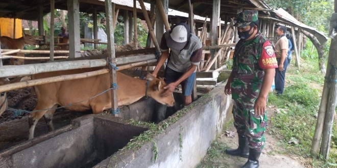 BADUNG – Babinsa Koramil 1611-04/Mengwi Serda Ketut Suweda melaksanakan pendampingan vaksin hewan ternak di Desa baha Kec. Mengwi Kab. Badung. Selasa (23/08/22).
