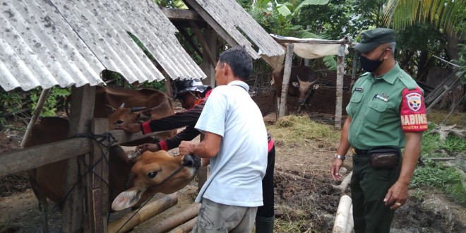 Denpasar – Babinsa Koramil 1611-01/Dentim Serda Made Sardika bersinergi dengan Bhabinkamtibmas memantau proses vaksinasi hewan ternak miliik warga dan penyemprotan cairan Disinfektan oleh Dinas Pertanian Kota Denpasar yang dipimpin oleh Drh.Eka Darmana di Wilayah Dusun Bekul Desa Penatih Dangin Puri Kecamatan Denpasar Timur Kota Denpasar. Rabu (13/07/22).