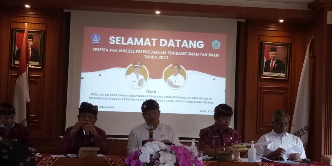 Sambutan Kepala Desa Kutuh menyampaikan Pra musdes Tahunan di Tahun 2023 dan juga persiapan bimtek desa anti korupsi desa kutuh sudah meraih 10 besar dari 100 desa se-indonesia ini kita harus bangga karena sebuah prestasi bagi desa kita perlu juga pemantapan dari masing2 bidang sehingga harus menjadi yang terbaik yang penting kita berbuat waktu yang akan menjawab.
