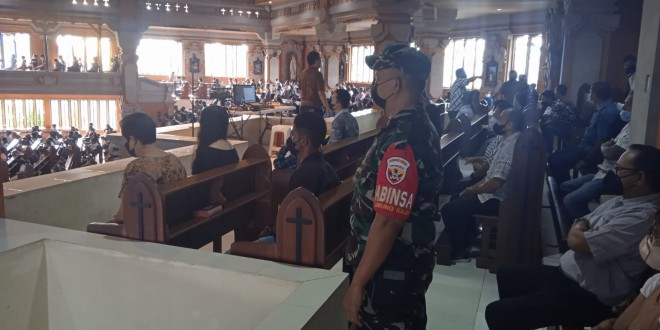 Denpasar – Dalam rangka penegakan disiplin mematuhi Protokol Kesehatan (Prokes), Babinsa Koramil 1611-01/Dentim melaksanakan pemantauan di rumah ibadah untuk memberikan himbauan kepada jemaat yang sedang melaksanakan ibadah di Gereja YGYB Jalan Sari Dana 1A Dusun Uma Sari Desa Ubung Kaja, Denpasar utara Kota Denpasar mengenai penerapan protokol kesehatan. Minggu (03/04/22).