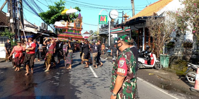 Badung – Babinsa Koramil 1611-03/Kuta Sertu Cening Tangkas dan Serda Dominggus Djaga bersama Bhabinkamtibmas serta pecalang memantau kegiatan pengabenan warga yang bertempat di setra Desa adat Canggu kec. Kuta Utara kab. Badung. Selasa (10/05/22).