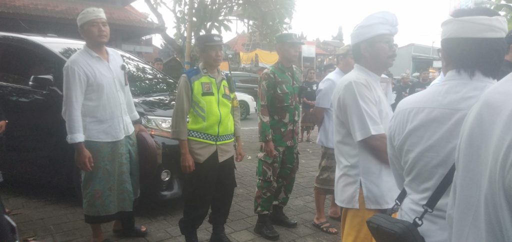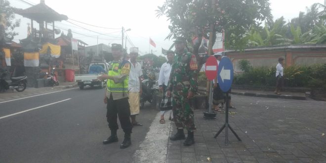 BADUNG – Pastikan agar kegiatan berjalan dengan aman dan lancar Babinsa Koramil 1611-04/Mengwi Serma I Wayan Budiastra bersama Bhabinkamtibmas menghadiri serta mengamankan arus lalu lintas demi kelancaran kegiatan.