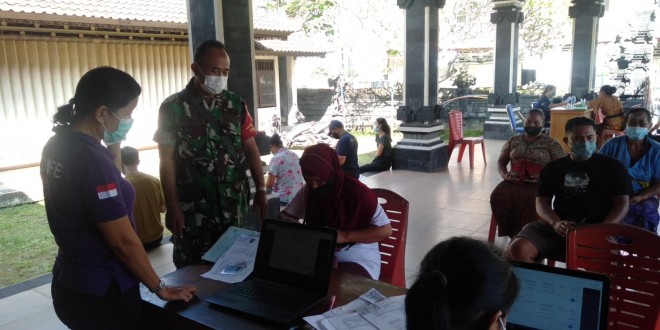 Badung – Dalam rangka mendukung Kegiatan Vaksinasi Covid 19 dan memutus penularan Covid-19, Babinsa Koramil 1611-04/Mengwi Peltu I Gusti Suprapto melaksanakan pemantauan kepada warganya dalam vaksinasi tahap 3 Boster golongan usia 18 tahun ke atas yang di selenggarakan Puskesmas mengwi II Badung yang bertempat di bale banjar Gunung pande desa Tumbakbayuh, Kecamatan Mengwi, Kabupaten Badung. Selasa (15/03/2022)