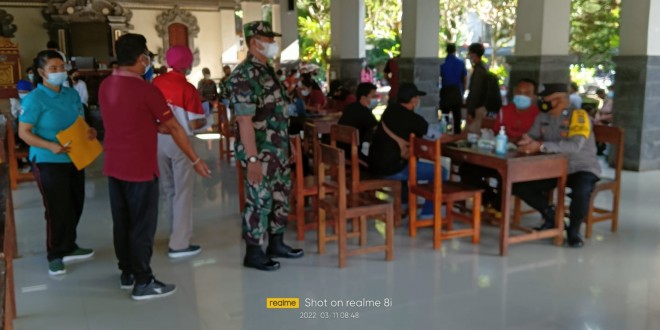 Badung – Dalam rangka mendukung Kegiatan Vaksinasi Covid 19 dan memutus penularan Covid-19, Babinsa Koramil 1611-04/Mengwi Serda Emanuel Koko Leo melaksanakan pemantauan kepada warganya dalam vaksinasi tahap III Boster golongan usia 18 tahun ke atas dan Lansia yang di selenggarakan Puskesmas Mengwi I dan Pustu Desa Sembung, dengan tim vaksinator dari Polres Badung di Aula Sekolah SMP 4 Sembung Br. Karanjung Desa Sembung, Kec. Mengwi, Kab Badung. Jum at (11/03/2022)