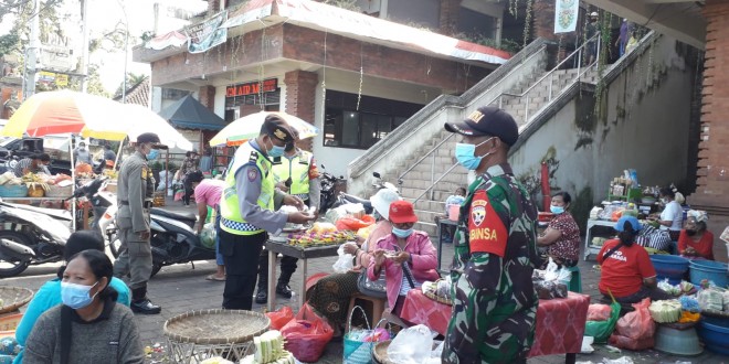 Badung – Dalam rangka meningkatkan kesadaran masyarakat untuk mematuhi protokol kesehatan Covid-19, sesuai Pemberlakuan Pembatasan Kegiatan Masyarakat. Babinsa Koramil 1611-05/Abiansemal Bersama Babinkamtimas dan Sat Pol PP melaksanakan pendisiplinan Prokes bertempat di pasar adat desa blahkiuh Kec.Abiansrmal Kab.Badung Senin 7/2/2022