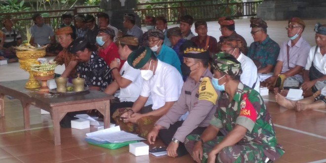 Badung – Babinsa Koramil 1611-05/Abiansemal Serka I Nyoman Anom Bersama Bhabinkamtibmas menghadiri rapat desa adat yang bertempat di Wantilan Desa adat Bongkasa , kec.Abiansemal , Kab. Badung. Tetap patuhi protocol kesehatan. Minggu (17/04/22).