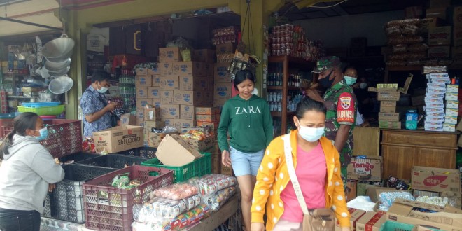 Babinsa Koramil 1611-06/Petang Peltu Dewa Sena mengelilingi kawasan pasar dan pertokoan sambil menyampaikan himbauan yang disampaikan tentang 3M yaitu memakai masker, menjaga jarak dan mencuci tangan dengan sabun pada air mengalir serta mengurangi mobilitas untuk mencegah penularan Covid-19.