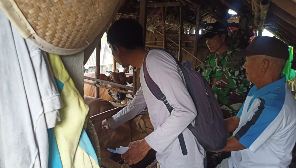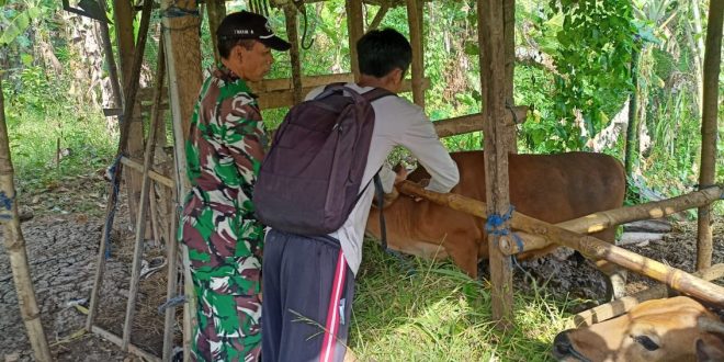 BADUNG – Babinsa Desa Mengwi Koramil 1611-04/Mengwi Serma Wayan Budu=iastra bersama Bhabinkamtibmas mendampingi pelaksanaan vaksin Penyakit Mulut dan Kuku (PMK).