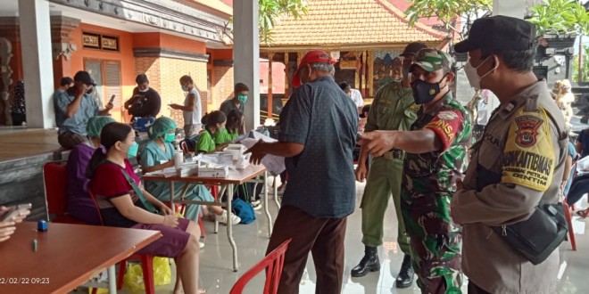 Denpasar – Dalam rangka mempercepat serbuan Vaksinasi Ke 3 di wilayah Kota Denpasar dan sebagai upaya memutus rantai penyebaran Covid-19,Babinsa 1611-01/Dentim Serda Ketut Lopi bersama Bhabinkamtibmas memantau pelaksanaan Vaksinasi ke 3 Booster bertempat di Balai Banjar Bukit Buwung,Desa Kesiman Petilan Denpasar Timur. Selasa 22/02/2022