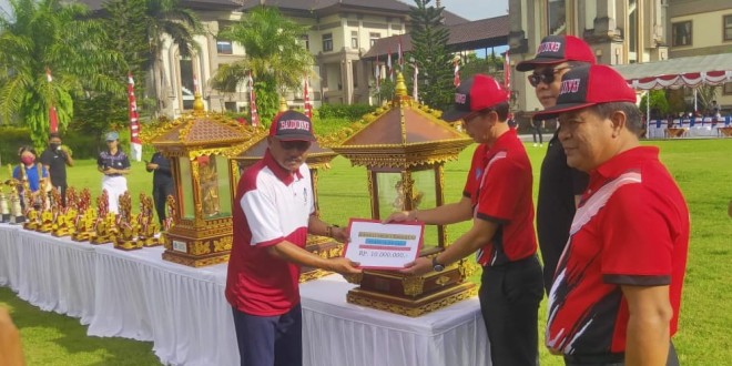 Penyeraan Piala Bergilir kepada juara umum Pekan Olahraga dan Seni Pelajar Kab. Badung tahun 2023 oleh pembina upacara didampingi Ketua DPRD Kab. Badung dan Ketua Panitia Penyelenggara.