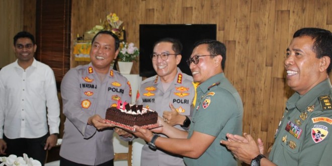DENPASAR – Dalam suasana Idul Adha 1444 H dan HUT Bhayangkara Ke-77 tahun 2023, Dandim 1611/Badung Letkol Arh Teguh Waluyo, S.I.P., bersama Perwira Staf, sambangi Mapolresta Denpasar berikan surprise ke Kapolresta Denpasar Kombes Pol. Bambang Yugo Pamungkas, S.H., S.I.K., M.Si., Senin, (03/07/2023).