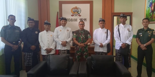 Denpasar – Dandim 1611/Badung Kolonel Inf. Dody Triyo Hadi s. sos. M.Si didampingi Pjs. Pasi Intel Dim 1611/Badung Kapten Arm. Kadek Mahatma dan Paur Ter Dim 1611/Badung Letda Inf. Wayan Sudana menerima Audensi Pengurus Harian PHDI Kota Denpasar di Ruang Kerja Dandim 1611/Badung Jl. Sugianyar No 6 Kota Denpasar. Rabu (06/07/22).