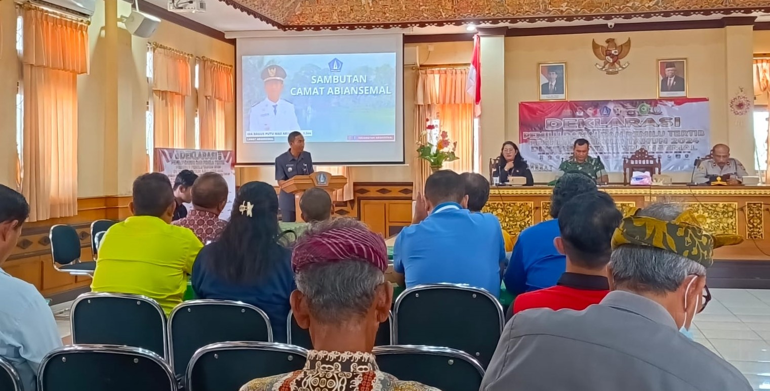 Kegiatan Deklarasi Pemilu Damai dan Pemilu Tertib Peserta Pemilu Tahun 2024 bertempat di Aula Pertemuan Kantor Camat Abiansemal Kab. Badung. Jum’at (13/10/23).