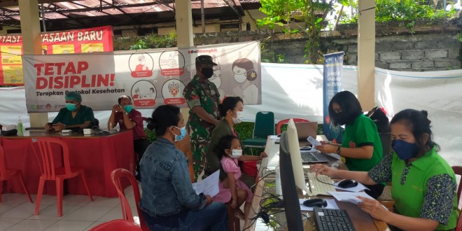 Badung – Guna memutus rantai penyebaran Covid-19 serta mendukung program Pemerintah Pusat, Kodim 1611/Badung bekerjasama dengan Tim Nakes RSAD/Udayana dipimpin oleh Dr Anggi dibantu staf berjumlah 10 orang dan Puskesmas Petang I melaksanakan kegiatan vaksinasi Tahap 1,2 dan 3 Booster Covid-19, bertempat di halaman puskesmas Petang 1 kecamatan Petang Kabupaten Badung. Senin (18/04/22)