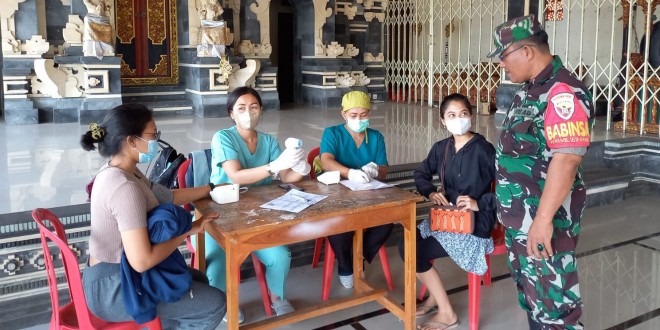 BADUNG – Babinsa Koramil 1611-04/Mengwi Serda Ketut Suweda bersinergi dengan Bhabinkamtibmas memantau pelaksanaan Vaksinasi tahap 3 Booster untuk masyarakat umum yang bertempat di Br. Tengah Desa Sobangan Kec. Mengwi, Kab. Badung. Rabu (31/08/22).