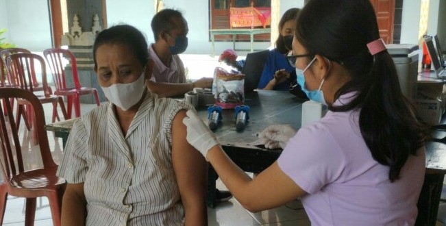 DENPASAR – Babinsa Kodim 1611-02/Densel Sertu Made Mastra bersama Bhabinkamtibmas mendampingi petugas kesehatan dalam pelaksanaan vaksin tahap 3 booster untuk masyarakat umum di Jl. Pulau Sailus Banjar Pande Kel. Pedungan Kec. Denpasar Selatan, Kota Denpasar. Rabu (24/08/22).