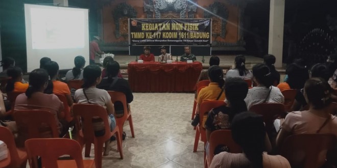 Plh. Pasiter Kodim 1611/Badung Kapten Inf Wayan Suara yang mewakili Dandim 1611/Badung sebagai Narasumber dalam kegiatan penyuluhan Bela Negara (Belneg) dan Wawasan Kebangsaan (Wasbang), dalam rangkaian kegiatan TMMD ke-117 yang tampak diikuti oleh masyarakat sejumlah sekitar 75 orang.