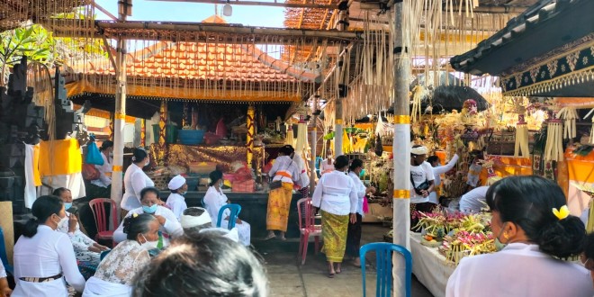 Denpasar – Babinsa Koramil 1611-01/Dentim Peltu Made Arka bersama Bhabinkamtibmas dan pecalang melaksanakan penerapan prokes di acara keagamaan yang bertempat di Br.Peninjoan Desa Peguyangan Kangin Kec. Denut Kota Denpasar. Kamis (19/05/22).