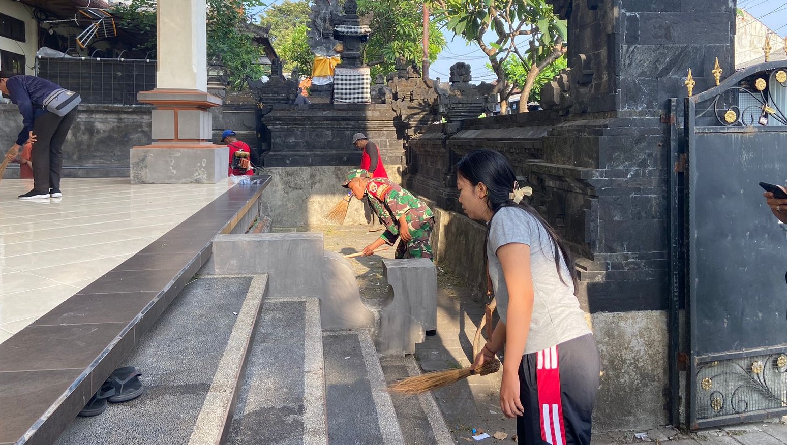 DENPASAR – Babinsa Koramil 1611-07/Denbar Kodim 1611/Badung Kopka Hadi Nuryanto bersama perangkat kelurahan dan warga melaksanakan gotong royong pembersihan dipimpin oleh Seklur Padangsambian bertempat di Jalan Tangkuban Perahu Bale Desa Adat Padangsambian Kelurahan Padangsambian Kecamatan Denbar Kota Denpasar. Jum’at (10/11/23).