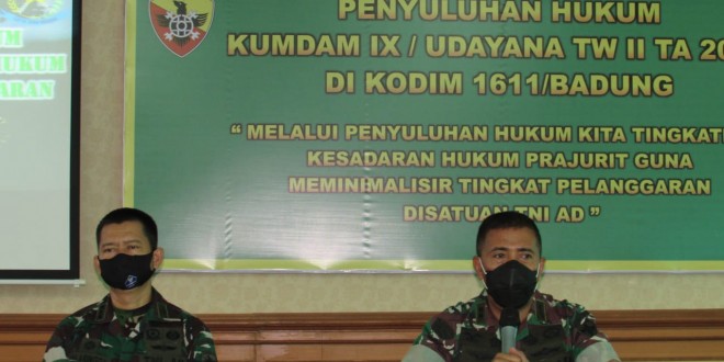 Denpasar – Guna untuk meningkatkan kesadaran hukum dan meminimalisir tingkat pelanggaran, Kodim 1611/Badung mendapatkan penyuluhan hukum Kumdam IX/Udayana TW. II TA. 2022, dengan tema “Melalui Penyuluhan Hukum Kita Tingkatkan Kesadaran Hukum Prajurit Guna Meminimalisir Tingkat Pelanggaran di Satuan TNI AD”, yang dibuka oleh Kasdim 1611/Badung Letkol Inf Pedro Soares Sarmento, sebagai penyelenggara Kumdam IX/Udayana, diikuti sekitar 45 orang yang bertempat di Aula Kodim 1611/Badung, Jl. Sugianyar No. 6, Kota Denpasar. Selasa (26/04/22)