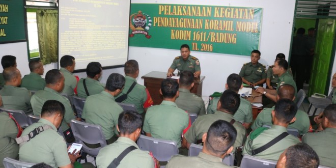 Pada hari Selasa tanggal 1 Maret 2016 pukul 08.00 Wita bertempat di Aula Koramil 1611-03/Kuta Kodim 1611/Badung telah dilaksanakan kegiatan Pendayagunaan Koramil Model TA. 2016 yang dibuka oleh Dandim 1611/Badung (Letnan Kolonel Czi M. Leo Pola Ardiansa S, S.H.) yang mana dalam amanatnya menyampaikan bahwa pemberdayaan Koramil Model difokuskan pada peningkatan sumber daya manusia Apkowil yang telah bertugas sebagai Babinsa maupun personel baru yang akan bertugas di wilayah Kodim 1611/Badung. Materi yang diberikan dalam pendayagunaan Koramil Model adalah Sikap Teritorial, Lima Kemampuan Teritorial, Metode Binter, Pengetahuan Bintal Kejuangan, Pengetahuan Militer Umum, Pengetahuan Sosial/Pendukung (Orgas Desa/Kelurahan, Kecamatan dan Pengetahuan sesuai Tipologi). Kegiatan Koramil Model diikuti oleh 50 orang anggota dari satuan jajaran Kodim 1611/Badung.