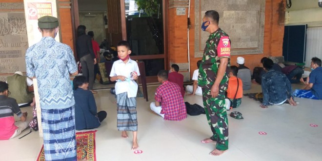 Denpasar – Babinsa Koramil 1611-07/Denbar Serda Bambang Purwito Bersama Bhabinkamtibmas melaksanakan pendisiplinan protokol kesehatan kepada warga binaan yang melaksanakan sholat Jum’at berjamaah di Masjid An Nur jln Diponegoro Br Sanglah timur Ds Dauh puri klod Kecamatan Denpasar Barat Kota Denpasar. Jum’at (13/05/22)