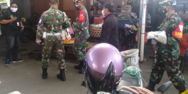 Denpasar – Dandim 1611/Badung Kol. Inf I Made Alit Yudana, membagi-bagikan masker kepada warga bertempat di Pasar Wangaya Klod, jalan Kartini, Banjar Wangaya Klod, Desa Dauh Puri Kaja, Denpasar Utara.
