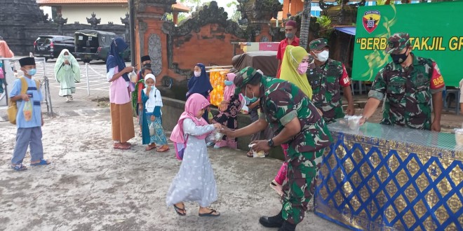 Badung – Kodim 1611/Badung membagikan Takjil Gratis kepada Masyarakat di Bulan Ramadhan yang bertempat di Masjid Nurul Huda Bandara I Gusti Ngurah Rai Tuban kec. Kuta Kab. Badung.Selasa(19/04/22).