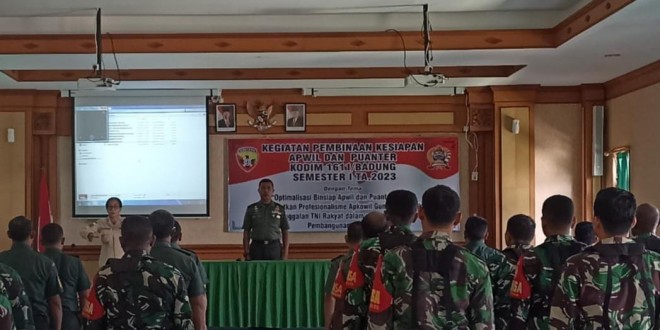 Komandan Kodim (Dandim) 1611/Badung Letkol Arh Teguh Waluyo, S.I.P. yang dalam hal ini diwakili oleh Kasdim 1611/Badung Letkol Inf Pedro Soares Sarmento membuka secara resmi kegiatan Binsiap Apwil Dan Puanter Semester I TA 2023 yang bertema “Optimalisasi Binsiap Apwil dan Puanter Untuk Meningkatkan Profesionalisme Apkowil Guna Mewujudkan Kemanunggalan TNI Rakyat Dalam Rangka Mendukung Pembangunan Nasional” yang dihadiri oleh seluruh Perwira Staf, Para Danramil serta seluruh Babinsa jajaran Kodim 1611/Badung.