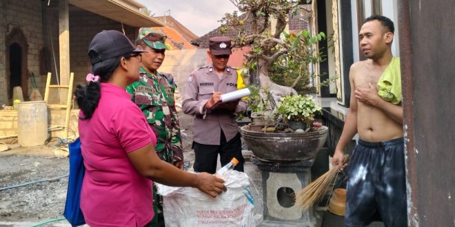BADUNG – Babinsa Koramil 1611-04/Mengwi Serma Putu Putra Antara bersama dengan Bhabinkamtibmas serta Ketua PKK Desa melakukan sosialisasi Sosialisasi dan Edukasi Pemilahan Sampah ke rumah warga desa Buduk Kec. Mengwi Kab. Badung. Selasa (07/11/23).
