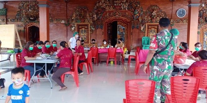 Badung – Babinsa Koramil 16110-5/Abiansemal memantau Posyandu Balita dan lansia disertai pemeriksaan payudara gratis yang di selenggarakan oleh Dinas Kesehatan Kabupaten Badung kepada ibu-ibu dan balita bertempat di Br Lambing Desa Sibangkaja kecamatan Abiansemal Kabupaten Badung. Senin (11/04/22).