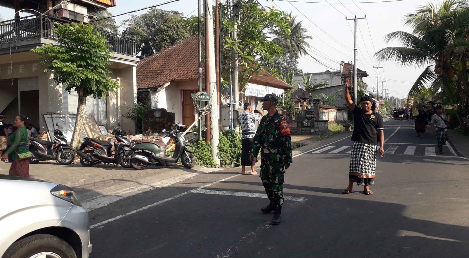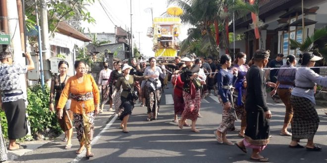 BADUNG – Babinsa Koramil 1611-05/Abiansemal Serma Nyoman Anom bersama Bhabinkamtibmas dan Pecalang serta Linmas melaksanakan Pengamanan dan Pengaturan Lalin Kegiatan Upacara Ngaben.