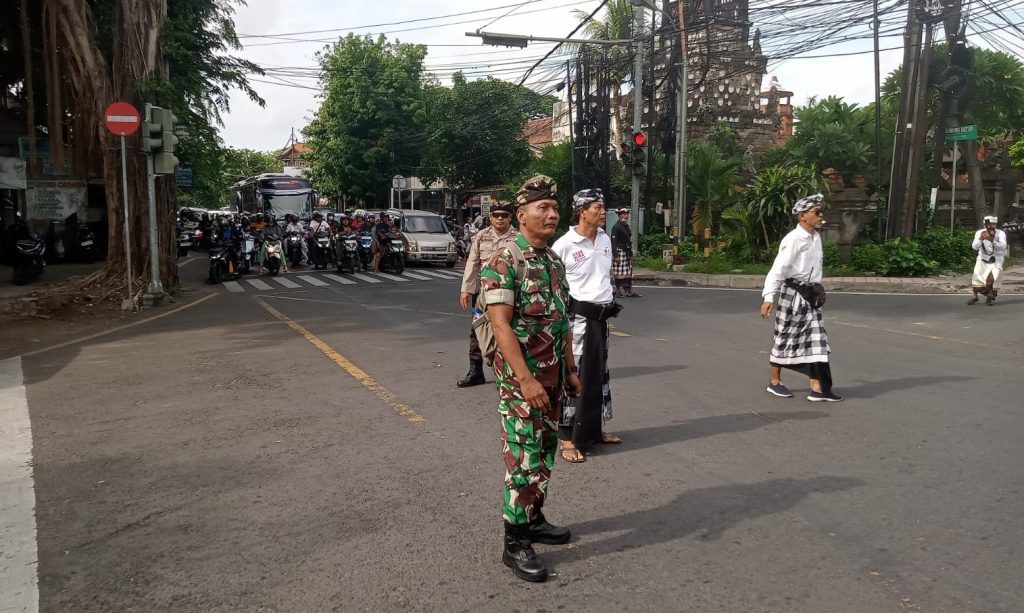 DENPASAR – Guna memastikan agar kegiatan dapat berjalan dengan aman dan lancar Babinsa Koramil 1611-07/Denbar Pelda Gede Ribek bersinergi dengan Bhabinkamtibmas dan pecalang memantau serta mengamankan kegiatan petirtan dan pawintenan penglingsir puri agung pemecutan serta pengesahan pemgurus pusat lembaga warga ageng puri agung pemecutan.