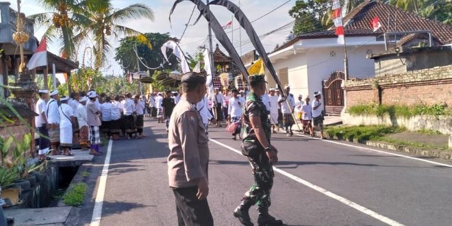 BADUNG – Guna memastikan agar kegiatan berjalan dengan aman dan lancar Babinsa Koramil 1611-04/Mengwi Serda Putu Styo Asswatama bersinergi dengan Bhabinkamtibmas memantau serta pengaturan lalu lintas demi kelancaran kegiatan upacara Piodalan.