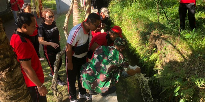 Badung – Guna menjaga kelestarian lingkungan dan ekosistem Babinsa Koramil 1611-05/Abs Kopda Abdullah bersinergi dengan Bhabinkamtibmas dan masyarakat melaksanakan gotong royong/pembersihan dan penyebaran bibit ikan nila di Desa Abiansemal Kec. Abiansemal Kab. Badung. Senin (30/05/22).