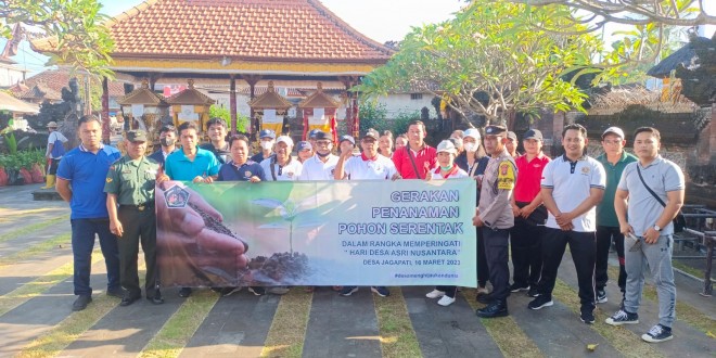 Badung – Babinsa Koramil 1611-05/Abiansemal Sertu Made Windia bersinergi dengan Bhabinkamtibmas mengikuti kegiatan Penanaman pohon kelapa dan bunga sandat dengan Tema Gerakan Penanaman Pohon Serentak dalam Rangka memperingati Hari Desa Asri Nusantara yang dilaksanakan oleh staf Desa Jagapati yang diikuti oleh ± 35 Orang Bertempat di areal Pura Kahyangan tiga dan sepanjang Jln Jagapati,Kec.Abiansemal,Kab.Badung. Kamis (16/03/23)