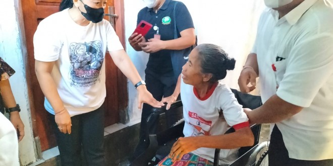 Denpasar – Kepedulian terhadap sesama Babinsa Koramil 1611-01/Dentim Peltu Made Arka mendampingi Penyerahan Bantuan berupa kursi Roda dan Sarana Prokes dalam rangkaian Bulan Bung Karno IV oleh Ibu Walikota Ny. Sagung Antari Jaya Negara di Jln.Cekomaria Gang I/ Betet Br.jenah Desa Peguyangan Kangin  Kec.Denut Kota Denpasar. Rabu (15/06/22)