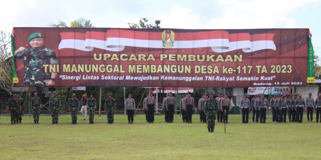 BADUNG – Program TNI Manunggal Membangun Desa (TMMD) Ke-117 Tahun 2023 yang dilaksanakan oleh Kodim 1611/Badung di Desa Darmasaba Kec. Abiansemal Kabupaten Badung resmi dibuka simbolis dengan melaksanakan upacara di lapangan setempat, Rabu (12/07/23).