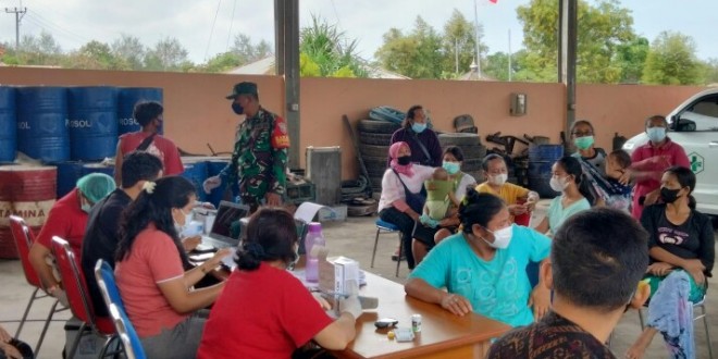 DENPASAR – Dalam rangka mendukung percepatan Vaksinasi Covid 19 Babinsa Koramil 1611-02/Densel Sertu Made Mastra bersinergi dengan Bhabinkamtibmas mendampingi petugas kesehatan dalam pelaksanaan Vaksin tahap 3 booster untuk warga masyarakat di kantor UPTD pengelolaan sampah suwung Br. Pesanggaran Kel. Pedungan Kec. Densel Kota Denpasar.Selasa (02/08/22).