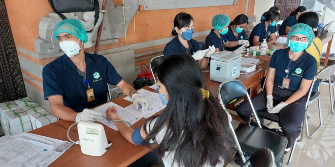 Tampak saat pelaksanaan vaksin tahap 3 Booster Lurah Padangsambian, Kepala Seksi Kelurahan Padangsambian, Para Kaling se Kelurahan Padangsambian, Babinsa, Babinkamtibmas, Linmas dan masyarakat yang akan melaksanakan vaksin.