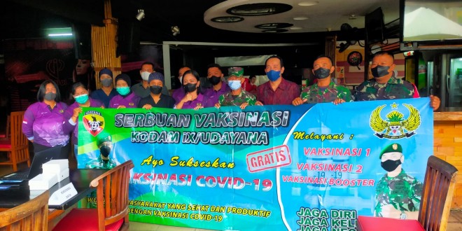 Badung – Guna memutus rantai penyebaran Covid-19 serta mendukung program Pemerintah Pusat, Kodim 1611/Badung bekerjasama dengan Tim Nakes RSAD/Udayana dipimpin drg. Lia Noviana, MM dan Polresta Denpasar yg dipimpin oleh: Dr Tara melaksanakan kegiatan vaksinasi ke 3 Booster bertempat di VI AI PI ,jln Legian Kuta. Kel Kuta ,Kec Kuta.Kab. Badung. Sabtu (23/04/22)
