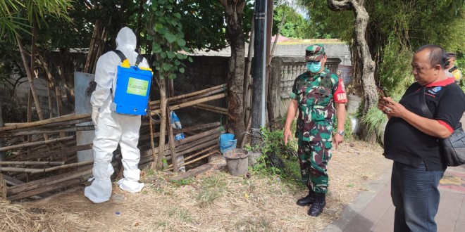 BADUNG – Babinsa |Koramil 1611-03/Kuta Serka Alfon bersinergi dengan Bhabinkamtibmas mendampingi petugas melaksanakan penyemprotan,oleh satgas PMK Kecamatan dan Kelurahan Kuta di Kandang Bapak Ketut Nuada Br. Jabe Jero Kuta Kec. Kuta Kab. Badung. Rabu (27/07/22)`