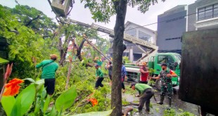 DENPASAR – Babinsa Koramil 1611-02/Densel Kodim 1611/Badung Serda Bonifius Mau bersama personel DLHK Kota Denpasar serta warga masyarakat bahu membahu membersihkan pohon tumbang yang yang mengakibatkan arus Lalu lintas pengguna Jalan terganggu maupun terputusnya aliran Listrik disekitar bertempat di Depan Pavilion Kichen Jalan Tukad Gangga Kel. Panjer Kec.Densel Kota Denpasar. …