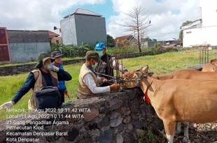 DENPASAR – Babinsa Koramil 1611-07/Denbar Sertu Ponirin bersinergi dengan Bhabinkamtibmas mendampingi petugas Dinas Pertanian dan peternakan melaksanakan Vaksin Booster dan vaksin 1 PMK di Ds Pemecutan Kelod Kec Denbar Kota Denpasar. Kamis (11/08/22). Vaksinasi hewan ternak yang dilaksanakan bertujuan untuk mencegah terjadinya PMK ( Penyakit Mulut dan Kaki ) yang …