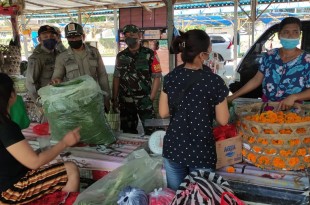 Badung – Dalam rangka menerapkan disiplin Protokol Kesehatan (Prokes) di masyarakat Babinsa Koramil 1611-04/Mengwi Sertu Ida Bgs Ambara bersama Satpol PP melaksanakan kegiatan pendisiplinan prokes ,pemberlakuan pembatasan kegiatan masyarakat (PPKM) level 2 dalam rangka menekan penyebaran Covid -19 di wilayah binaan bertempat di Pasar Adat Sembung dan Pasar Adat Gulingan …