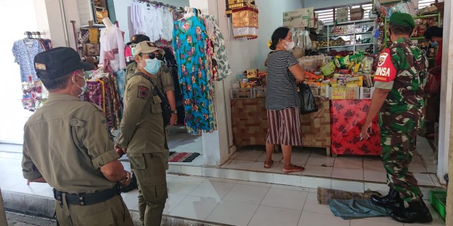 Saat pelaksanaan patrol Babinsa Koramil 1611-04/Mengwi Serka Wayan Sudarma bersama Satpol PP mendatangi toko, warung dan lapak para pedagang yang ada di pasar untuk melakukan himbauan kepada para pedagang atau pembeli yang ada disana untuk melaksanakan disiplin prokes khususnya melakukan pengecekan Prokes dan menghimbau,memakai masker,Cuci tangan, Menggunakan Hand Sanitizer serta Menjaga Jarak.ucap Babinsa